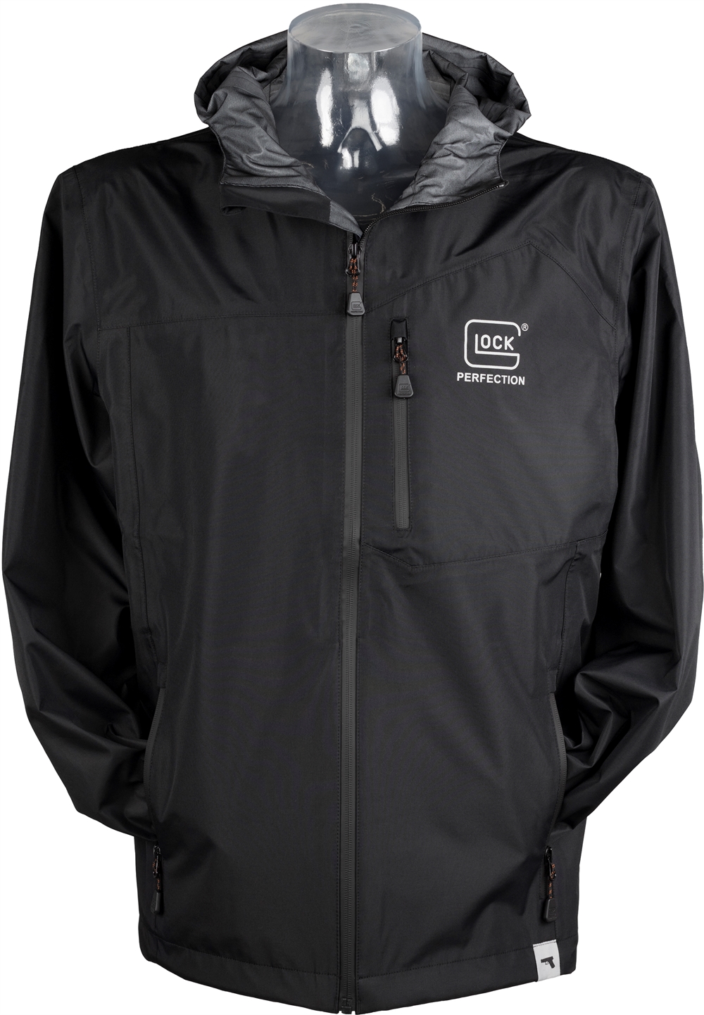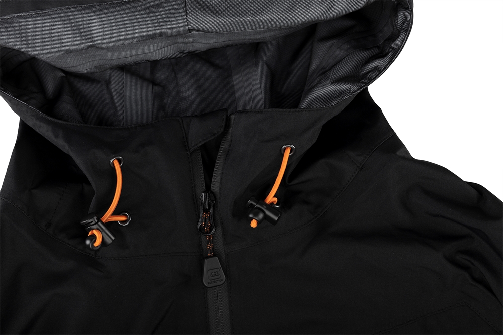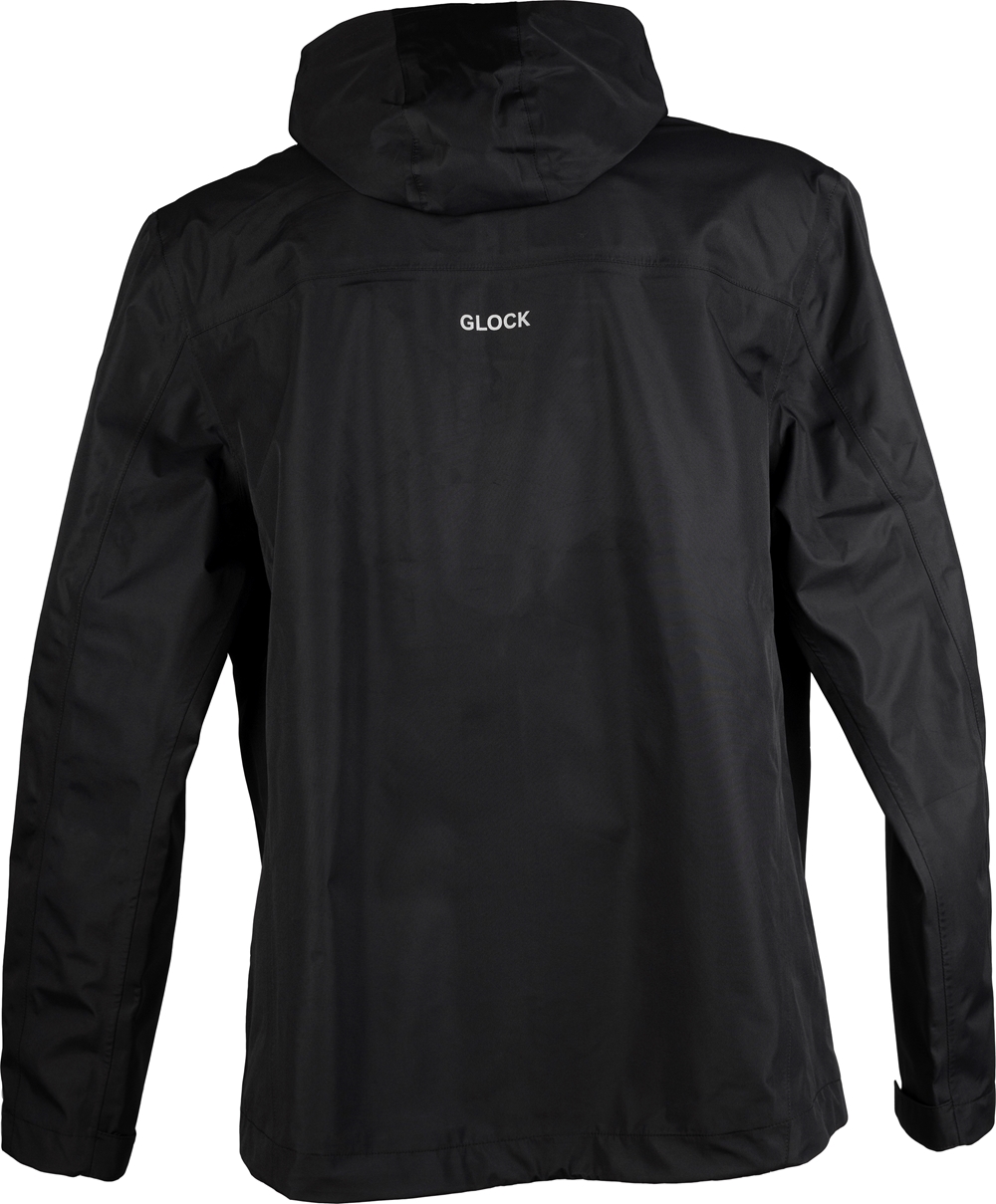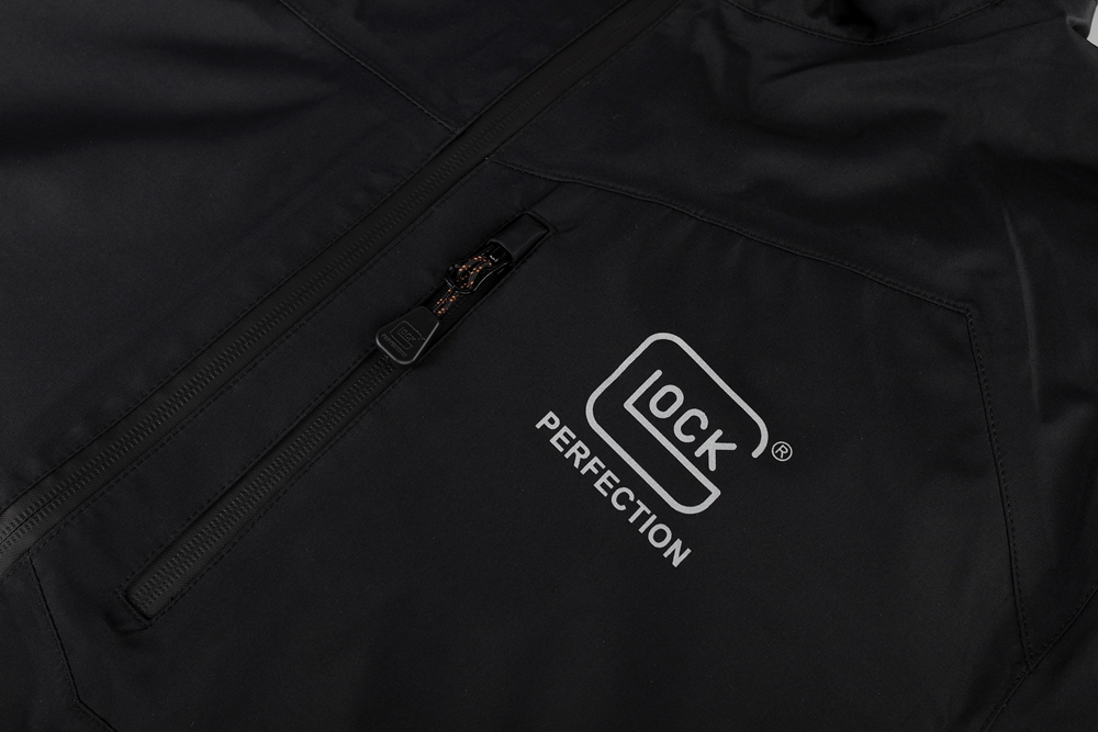 Veste hardshell noire avec le logo Glock Perfection imprimé sur la poitrine.